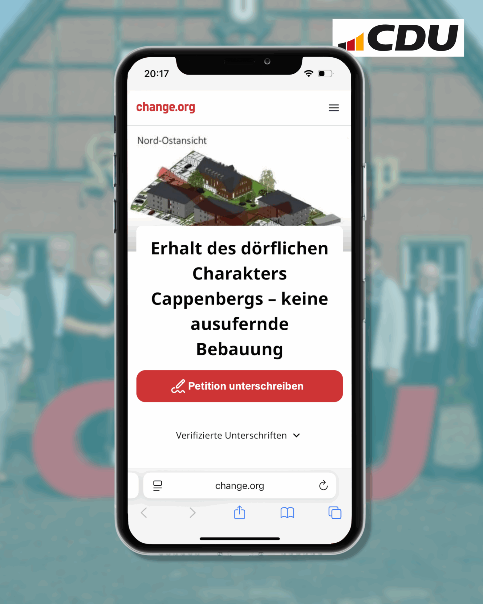 Cappenberg ist ein Ort mit Geschichte, Identität und einem besonderen dörflichen Charakter. Diesen gilt es auch in Zukunft zu bewahren. Gleichzeitig ist uns bewusst, dass der Bedarf an Wohnraum steigt – auch in Cappenberg. Als CDU Ortsunion Cappenberg ist es uns daher ein zentrales Anliegen, zwischen notwendigen Entwicklungen und dem Erhalt unseres Ortsbildes eine ausgewogene… Petition gestartet: Für den Erhalt des dörflichen Charakters in Cappenberg weiterlesen