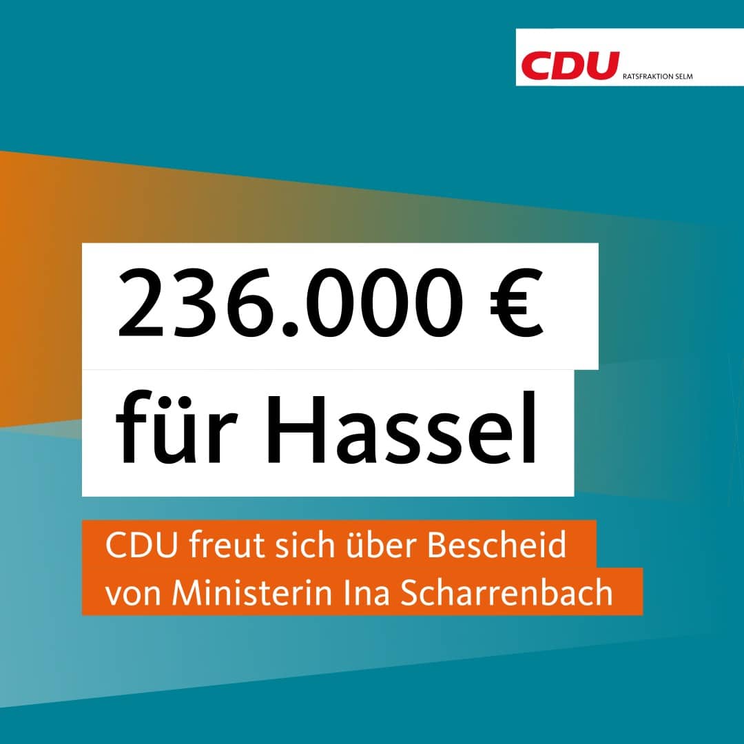Gute Nachrichten aus dem Ministerium für Heimat, Kommunales, Bauen und Gleichstellung erreichten die CDU-Fraktion am Gründonnerstag. Zur Sanierung und Erstellung eines Anbaus am Feuerwehrgerätehauses in Hassel erhält die Stadt Selm eine Fördersumme von rund 236.000 €.