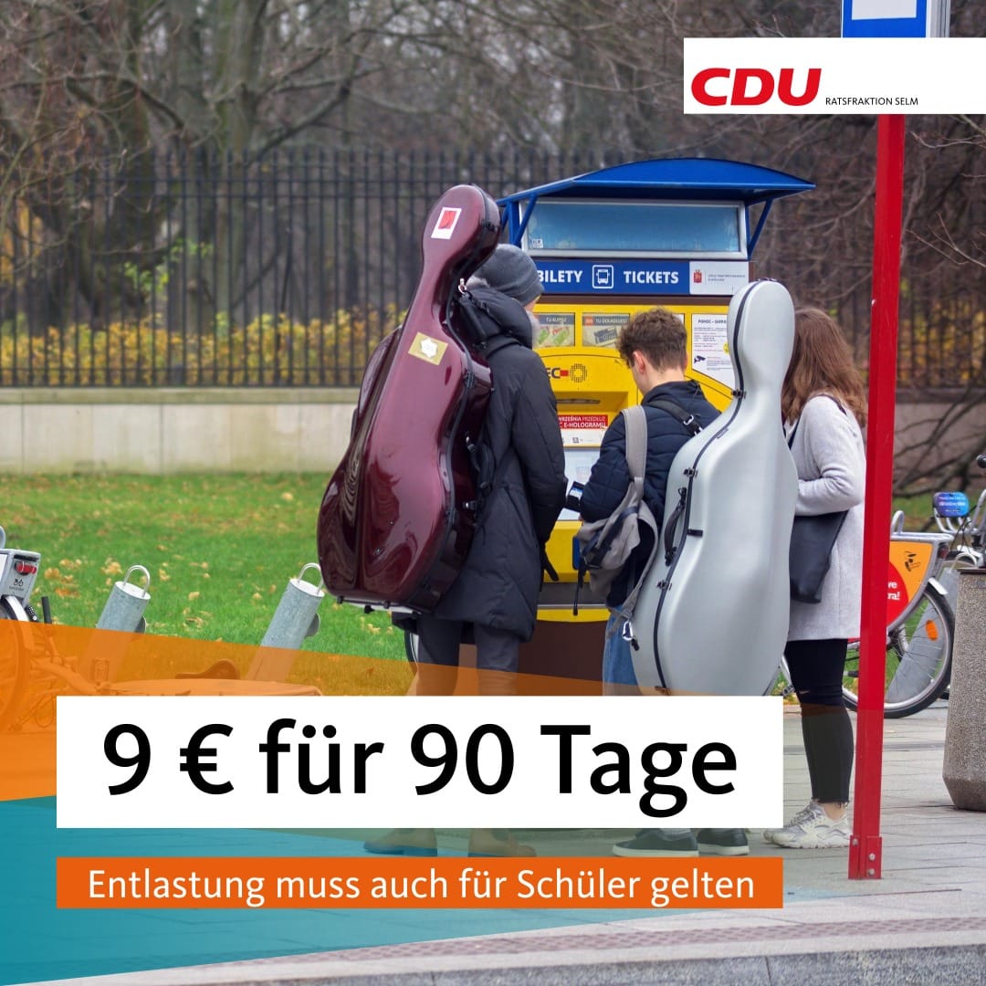 Die CDU-Fraktion im Rat der Stadt Selm fordert die Bundesregierung auf, klarzustellen, dass, wenn man schon Erwachsene durch ein 9-Euro-Ticket entlastet, erst recht auch Schülerinnen und Schüler zu entlasten sind. Der Rat der Stadt Selm hat im letzten Jahr die Einführung des Schülertickets Westfalen beschlossen. Eingeführt wurde das Ticket in Selm ab dem 1. Februar diesen Jahres. Hierfür bezahlen anspruchsberechtigte Familien für das erste Kind 12 Euro im Monat, für das zweite Kind sechs Euro im Monat und ab dem dritten Kind nichts mehr. Nichtanspruchsberechtigte Familien müssen für das Ticket 33 Euro monatlich bezahlen. Das Abo dauert mindestens 12 Monate.