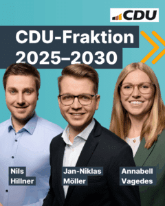 Im Beisein des neuen CDU-Bürgermeisters Heinz-Georg Mors hat sich am Sonntag die neue CDU-Fraktion im Rat der Stadt Selm in der Wahlperiode 2025–2030 konstituiert. Die Ratsmitglieder Michael Esters, Nils Hillner, Christian Köppeler, Michael Merten, Jan-Niklas Möller, Claudia Mors-Böckenbrink, Reinald Reher, Lisa Ricken, Annabell Vagedes, Ralf Vagedes und Michael Zolda bilden zukünftig die CDU-Fraktion im Rat der Stadt Selm. Zum neuen Vorsitzenden wählte die Fraktion Jan-Niklas Möller, der in der letzten Wahlperiode als Fraktionsgeschäftsführer