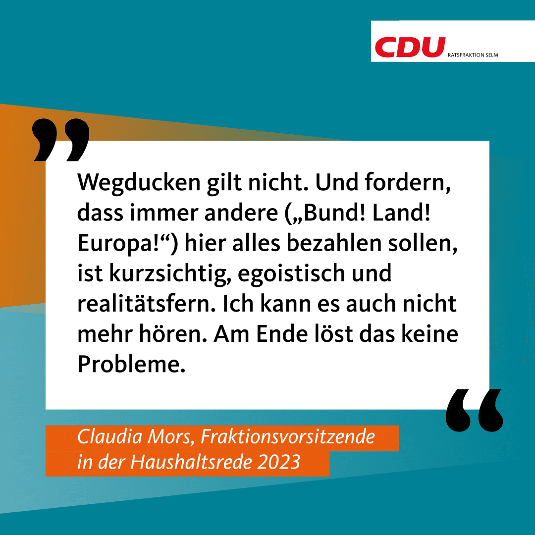 Die Vorsitzende der CDU-Fraktion im Rat der Stadt Selm, Claudia Mors, anlässlich der Beschlussfassung des Rates der Stadt Selm über die Haushaltssatzung 2023 mit dem Haushaltsplan 2023 in der Sitzung am 09.02.2023: